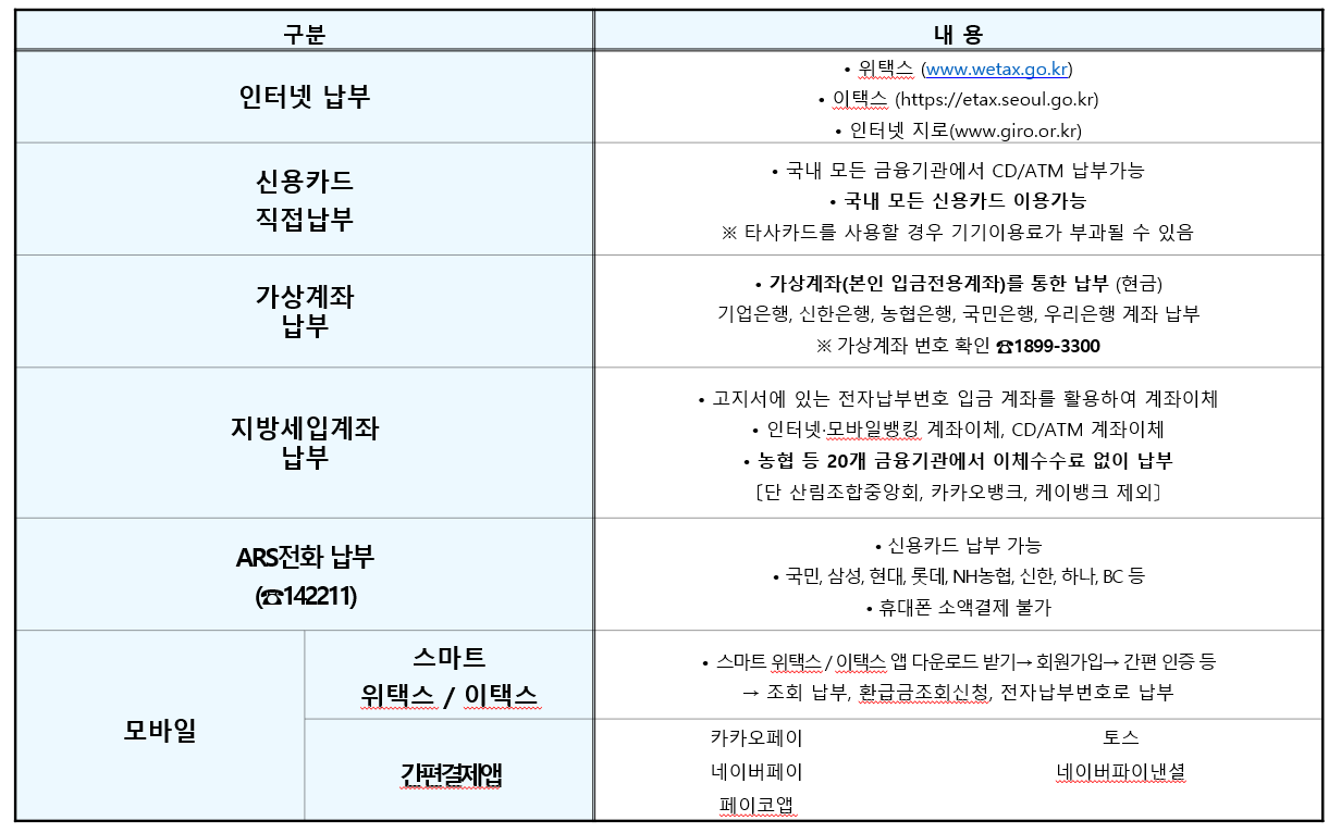 자동차세는 인터넷 납부, 신용카드 직접납부, 가상계좌 납부, 지방세입계좌 납부, ARS 납부, 스마트 위택스/이택스 (모바일), 간편결제 앱에서 납부 가능합니다.